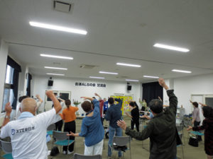 2024年10月19日、会津保健所にて行われたあいづALSの会秋の交流会に伺いました。いつもは地域の高齢者さんとの笑いヨガがほとんどで、ALSの患者さん、ご家族、医療職やボランティアさん方を前にしての笑いヨガは初めてでした。この会が四半世紀も続いていること、また、県下では会津にしかないことを伺って、これまでのご苦労が想像できました。また保健所の方々は土曜日の定休日にもかかわらず、所長さん始め保健師さん方が何人も参加されての協力には頭が下がります。笑いヨガの1時間、運動効果、リフレッシュ効果を感じて頂いたこと、楽しく、循環が良くなった等の感想をいただきました。長年介護されていらっしゃるご家族様から、ふだん動かさないところを動かせた、愚痴や文句がでてしまうが今日の体験を生かしたいとの感想もありました。逆に、お体に気を付けて頑張ってと励ましていただきました。感謝です。最後に所長さんがいつもDVDで笑いヨガをやっていますと言われたのは驚きで、嬉しくなりました。
