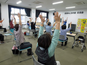 2024年10月19日、会津保健所にて行われたあいづALSの会秋の交流会に伺いました。いつもは地域の高齢者さんとの笑いヨガがほとんどで、ALSの患者さん、ご家族、医療職やボランティアさん方を前にしての笑いヨガは初めてでした。この会が四半世紀も続いていること、また、県下では会津にしかないことを伺って、これまでのご苦労が想像できました。また保健所の方々は土曜日の定休日にもかかわらず、所長さん始め保健師さん方が何人も参加されての協力には頭が下がります。笑いヨガの1時間、運動効果、リフレッシュ効果を感じて頂いたこと、楽しく、循環が良くなった等の感想をいただきました。長年介護されていらっしゃるご家族様から、ふだん動かさないところを動かせた、愚痴や文句がでてしまうが今日の体験を生かしたいとの感想もありました。逆に、お体に気を付けて頑張ってと励ましていただきました。感謝です。最後に所長さんがいつもDVDで笑いヨガをやっていますと言われたのは驚きで、嬉しくなりました。