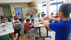 2019年8月21日、わかばカフェの第2週はお盆のお休みで第3週に笑いヨガの時間をいただきました。今回は花園町の集会と重なり初めての方2名を含めて20名の方がいらっしゃいました。猛暑が若干やわらぎこれからは少ししのぎやすくなることでしょう。コカリナの演奏とともにオープンし話がはずんでいました。スタッフさん手作りの瓜の漬物と大好きな甘酒を美味しくいただきました。20分の予定の笑いヨガがいつも30分になり、それでも疲れを見せずみなさんお元気です。いつもキーボード担当のHさんが、テレビのたまのやさんのコマーシャルに出る人たちよりわかばカフェの笑いヨガのほうが笑顔が素晴らしいと言われました。ホントにわかばカフェの皆さんは毎回楽しまれて、実際私の方が元気をもらいます。最後は365歩のマーチに合わせて貯筋体操をして終わります。(写真左は貯筋体操のスクワットに入る場面です。)